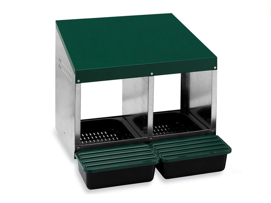 Snáškové dvojhnízdo pro nosnice z odolného materiálu, které usnadní sběr vajec a poskytne slepicím bezpečí a klid na snášku. Hnízdo se snadno čistí a je určeno pro cca 10 slepic.